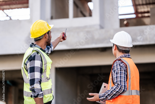 Asian people, two man, holding blueprints Structural engineers examine structural plans for office buildings and housing developments on-site, discussing work at construction site.