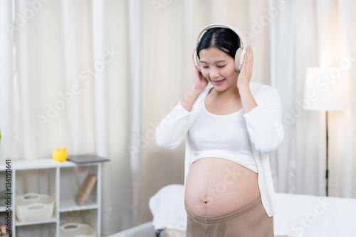Asian pregnant woman adjusting wireless headphones on ears while smiling, enjoying relaxation. Wearing a white cardigan and casual outfit in a cozy home environment embracing motherhood.