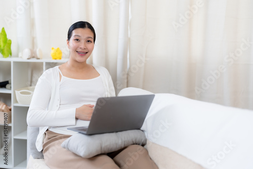 Asian pregnant woman sitting on a sofa using a laptop with a relaxed smile, enjoying a moment of productivity. Wearing a white cardigan and comfortable attire in a warm and cozy home environment.