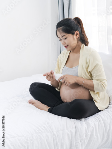 Asian pregnant woman with drugs in her hand, medical and health concept.