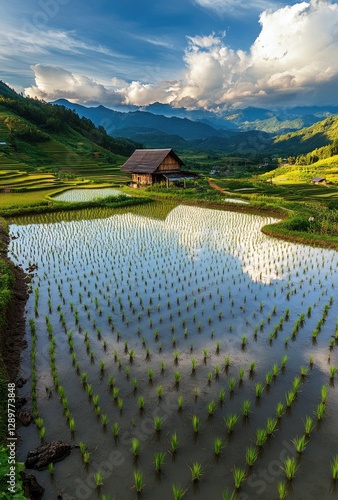 Asian Rice Terraces, Morning Sunlight, Mountain Hut, Tranquil Landscape
