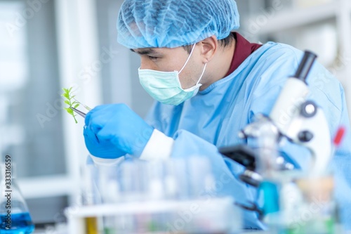 Asian scientists wear protective clothing while testing herbal medicines in the laboratory. Concepts, laboratory research on antiviral drugs, Covid 19 virus