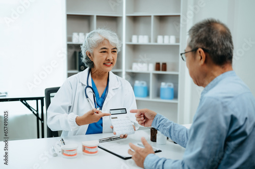 Asian Senior Doctor and patient discussing something while sitting at the table . Medicine and health care concept.