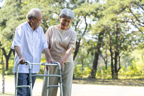 Asian senior husband take care to wife having knee pain while walking with walker stick in the park, Physical therapy in outdoor concept