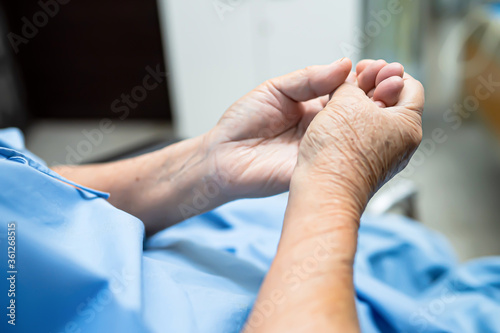 Asian senior or elderly old woman patient pain trigger finger lock her hand while sitting on bed in nursing hospital ward : healthy strong medical concept.