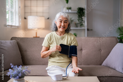 Asian senior woman blood pressure measure home medical device health wellness cozy living room self care check prevention