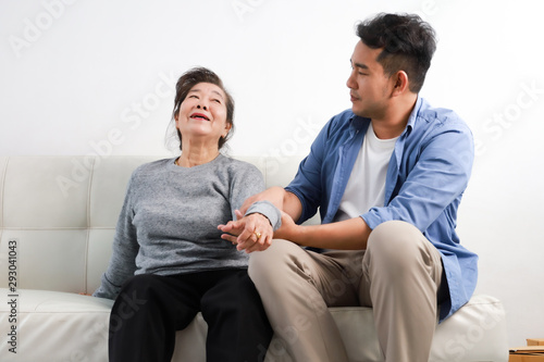 Asian senior woman mother and young man son in blue shirt massage his mother in living room