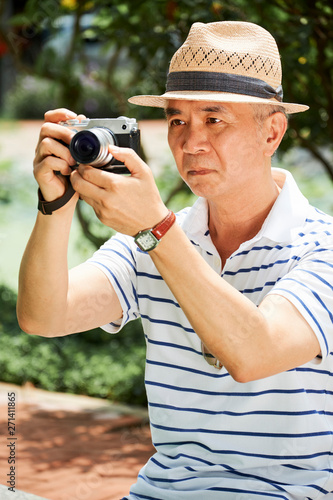 Asian serious man in hat taking photo with camera outdoors in sunny summer day