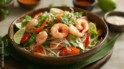 Asian Shrimp Noodle Salad with Fresh Vegetables Lime and Herbs in a Rustic Bowl Vibrant and Healthy Thai Cuisine