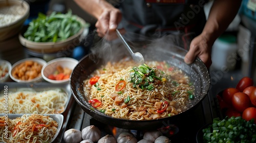 Asian street food scene, vendor cooking noodles, lively night market, copy space for text on left