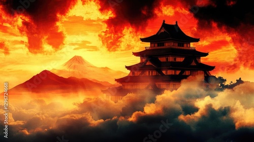 Asian Temple Amidst Fiery Sunset, Majestic Mountains