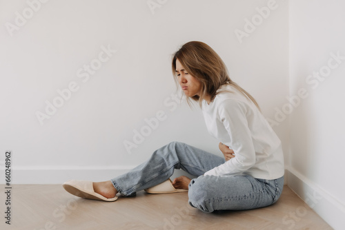 Asian Thai woman feeling sick and queasy, has a stomachache cramp, grabbing stomach with one hand and in white sweater, sitting on floor in white apartment room in winter alone.