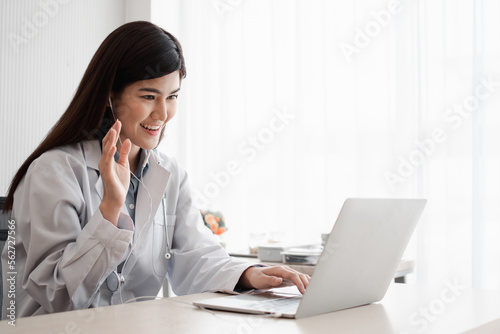 Asian therapist woman doctor is online visiting with a patient on the internet application. Her Listening and Give advice and explains how to treat the initial disease, Concept of Medical technology.