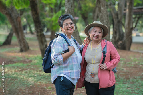 Asian tourists Take a backpack and walk through nature in one of Thailand's forest parks. The concept of going on vacation in retirement