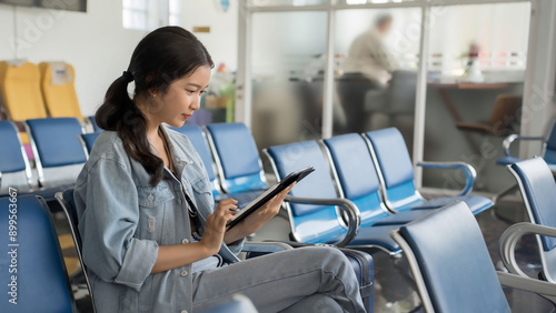 Asian traveler woman use tablet to surfing social media and typing to chat message while sitting on bench in terminal airport waiting to travelling vacation lifestyle by business travel class flight