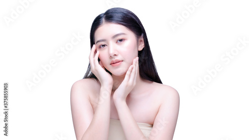 Asian woman beauty shot with half naked isolated on white background with clean fresh skin.