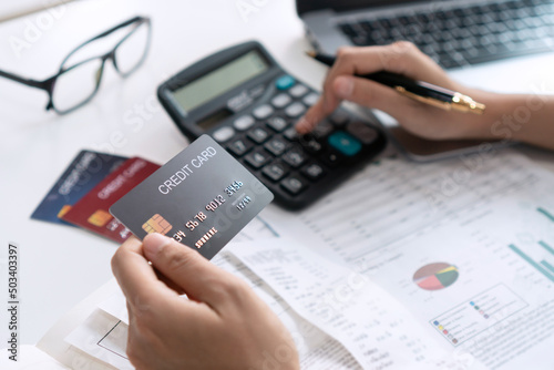 Asian woman checking bills, taxes, bank account balance and calculating credit card expenses. Family financial planning concept. Close up