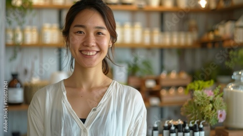 Asian woman entrepreneur promoting net zero initiatives in her retail store, emphasizing plastic-free packaging and eco care