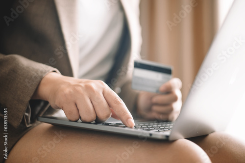 Asian woman holding credit card and using laptop computer for shopping online in website at home, e-commerce, internet banking, Technology and money transfer. Shopping and online payment concept.