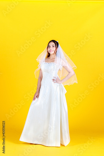 Asian woman in a white lace wedding dress there is a time to wear it on the head in yellow background. Concept happy love lovely.