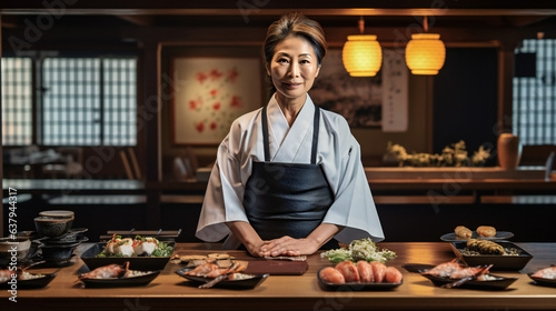 Asian Woman in Restaurant, Chef, Waitress, Owner, restaurant in background