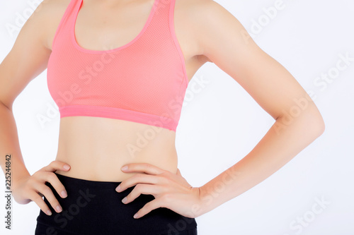 Asian woman in sport clothes and body diet and slim with measuring waist for weight isolated on white background, girl exercise have cellulite and calories loss, health and wellness concept.