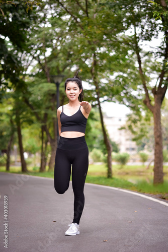 Asian woman is warm up, To make the muscles flexible Before going to jogging for good health and energy metabolism,Outdoors cross training workout. Healthcare concept