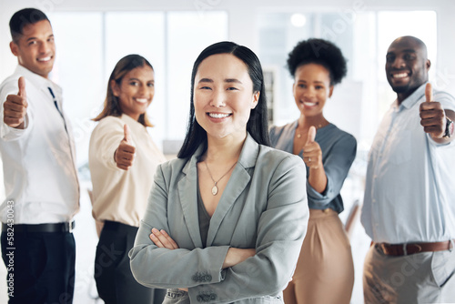 Asian woman, leadership and arms crossed, team and thumbs up, lead and professional mindset with collaboration. Diversity, teamwork and agreement, corporate group in workplace and smile in portrait