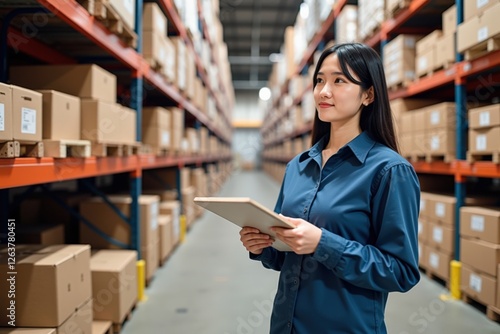 Asian Woman Organizing Inventory in a Modern Warehouse: Efficiently Managing Stock with a Digital Device in a Well-Structured Storage Environment
