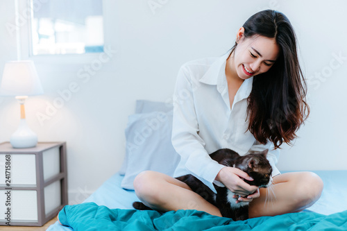 Asian woman playing with cat pet in the morning at holiday hobbie happy lifestyle in bedroom at home