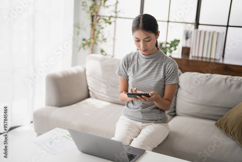 Asian Woman Pressing calculator for. financial planner remotely Personal finance at home.
