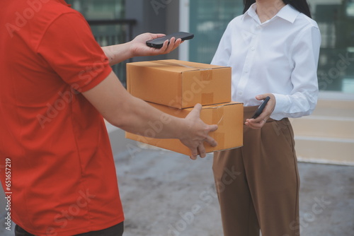 Asian Woman Receiving Product from delivery man at Home, Young Owner Woman Order Product from Smartphone Application, Woman with Online Business or SME Concept.