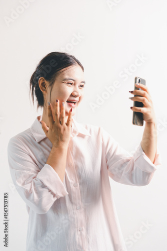 Asian woman rejoicing, looking happy, champion, fist pump gesture, standing over white background. young woman had happy, positive expression on her face, highlighted by bright smile.