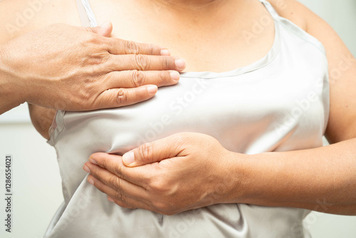 Asian woman self touching check lump or Breast cancer, Breast Self Exam.