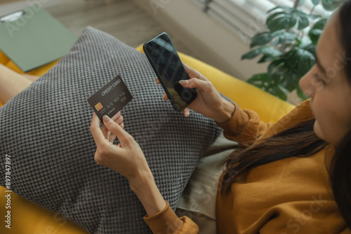 Asian woman sitting on the sofa in the living room, she is shopping online by paying by credit card, shopping on an online shopping platform, paying by credit card or debit card online.