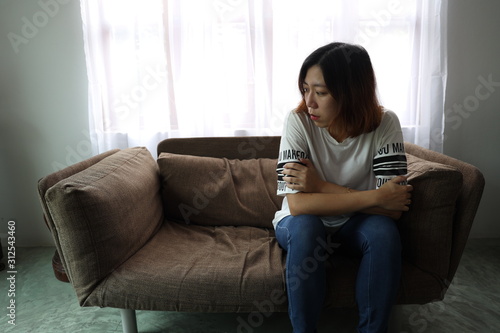 Asian woman stressful face with her hands cover of face. Short hair asian Woman feel lonely and sad sit alone on sofa bed in the living room