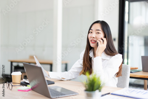 Asian woman talking on smartphone with laptop and project business planning in modern office.