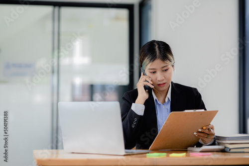 Asian woman talking on the phone, she is a salesperson in a startup company, she is calling customers to sell products and promotions. Concept of selling products through telephone channels.