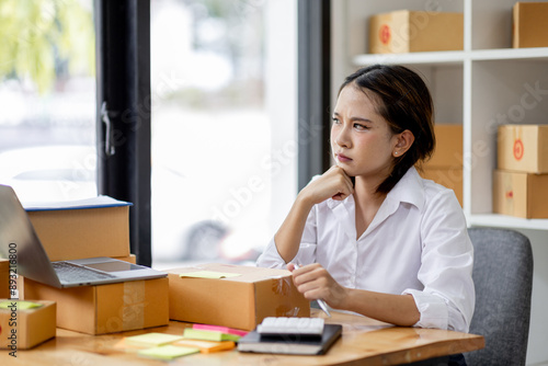 Asian woman think hard serious working of sme laptop computer at home selling online start up small business owner, e-commerce ideas concept.