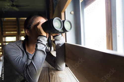 Asian woman using binoculars for birdwatching
