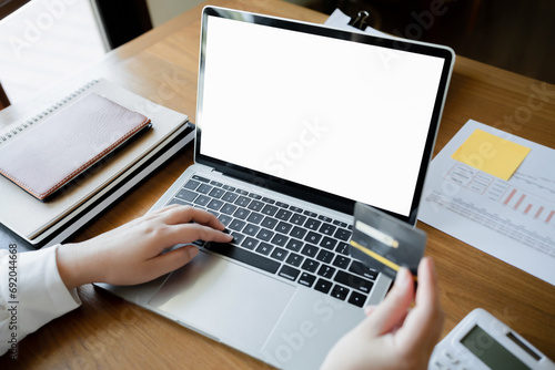 Asian woman using credit card for online payment shopping with empty white screen laptop isolated on white background