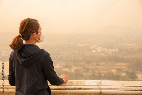 Asian woman wearing an N95 mask for protect bad air pollution.