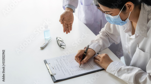Asian woman wearing protective mask and filling a coronavirus self reporting form with a doctor recommended at hospital. Medical and Health concept.