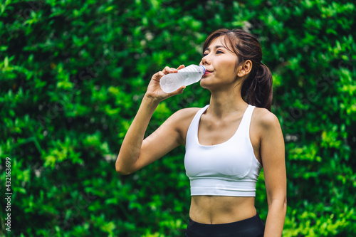 Asian woman wearing tight exercise clothes drinking water
