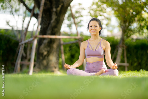 Asian woman wearing yoga clothes doing yoga at her village garden in the morning, happily, Sports healthy lifestyle concepts, Japanese concepts.