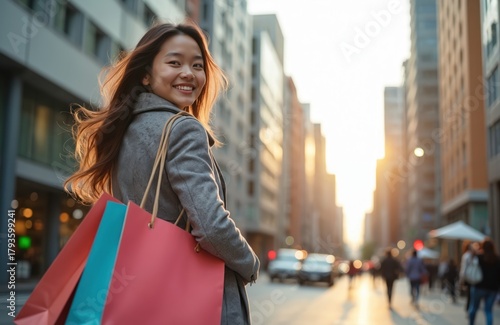 Asian woman with shopping bags walks down city street at sunset. She smiles looking over her shoulder, happy from her purchases on a sunny afternoon outing.