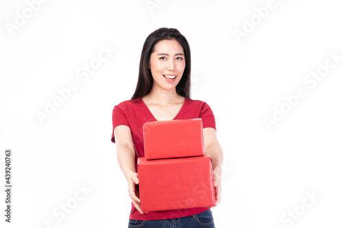 Asian women holding red present box. Portrait of happy smiling Asian girl in casual clothing holding gift box isolated on white. Happy pretty Asian woman holding red gift box on white background.
