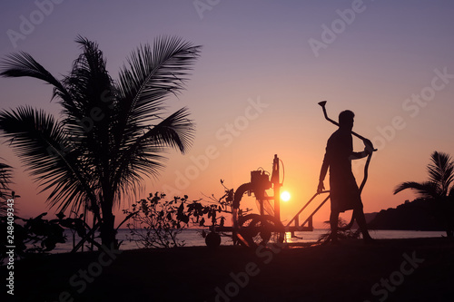 Asian worker clean a little of waste and piece of foam on the beach at sunrise sky early morning.