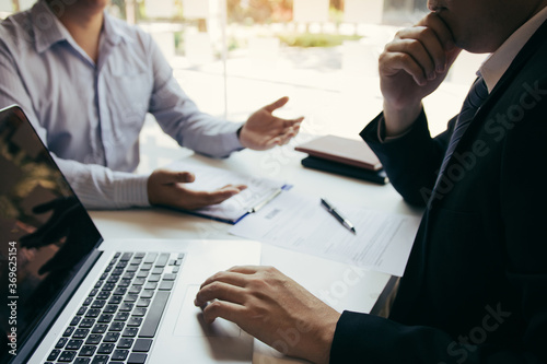 Asian young adult sitting at desk across from manager being interviewed job interview in business room.
