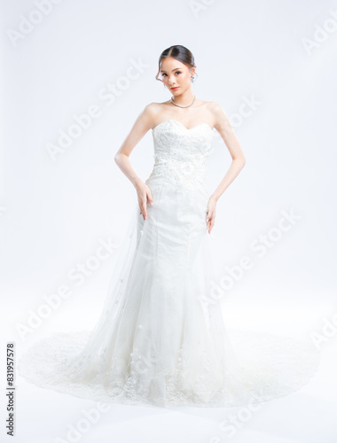 Asian young beautiful female portrait attractive model gorgeous charming bride wearing fashion wedding dress luxury perfect style, posing standing smile looking camera isolated white background studio